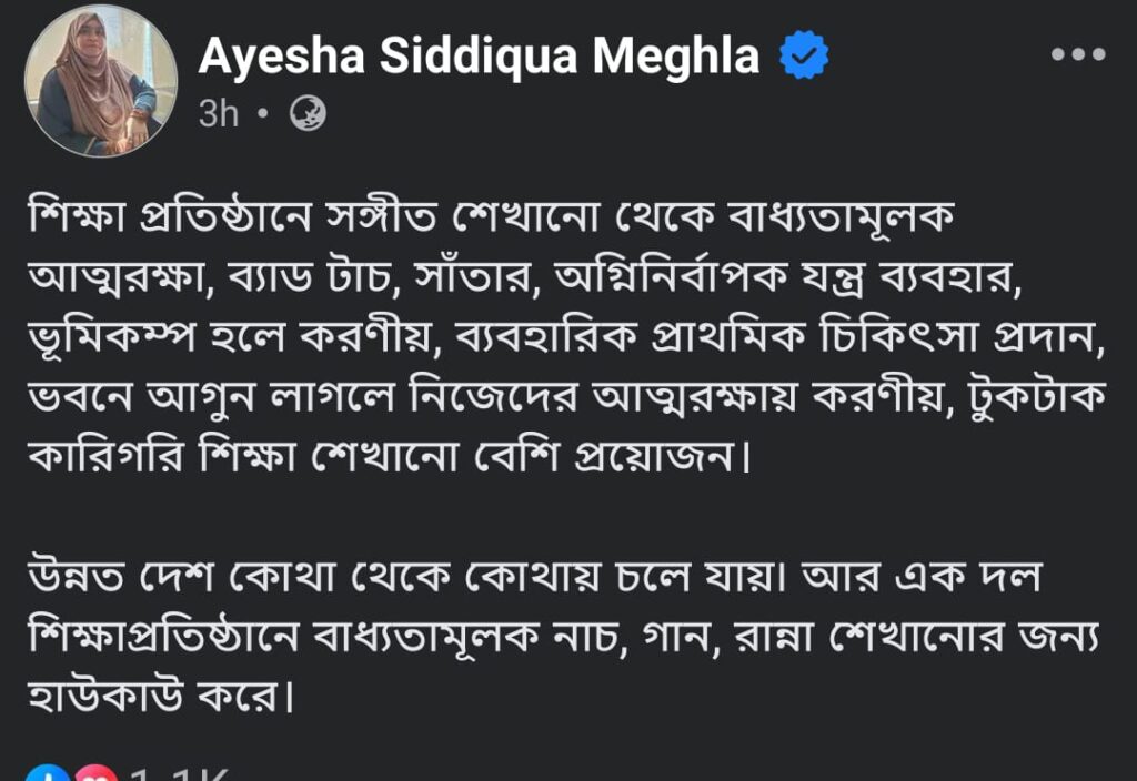In a thoughtful Facebook post, Meghla emphasized that students must learn essential survival and technical skills—such as self-defense, swimming, first aid, fire safety, earthquake response, and basic technical knowledge to face modern challenges with confidence.