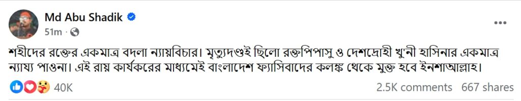 His statement reflects the sentiment of a section of students and political activists who believe that the verdict is essential for establishing justice and ending authoritarian practices that existed under Hasina’s rule.