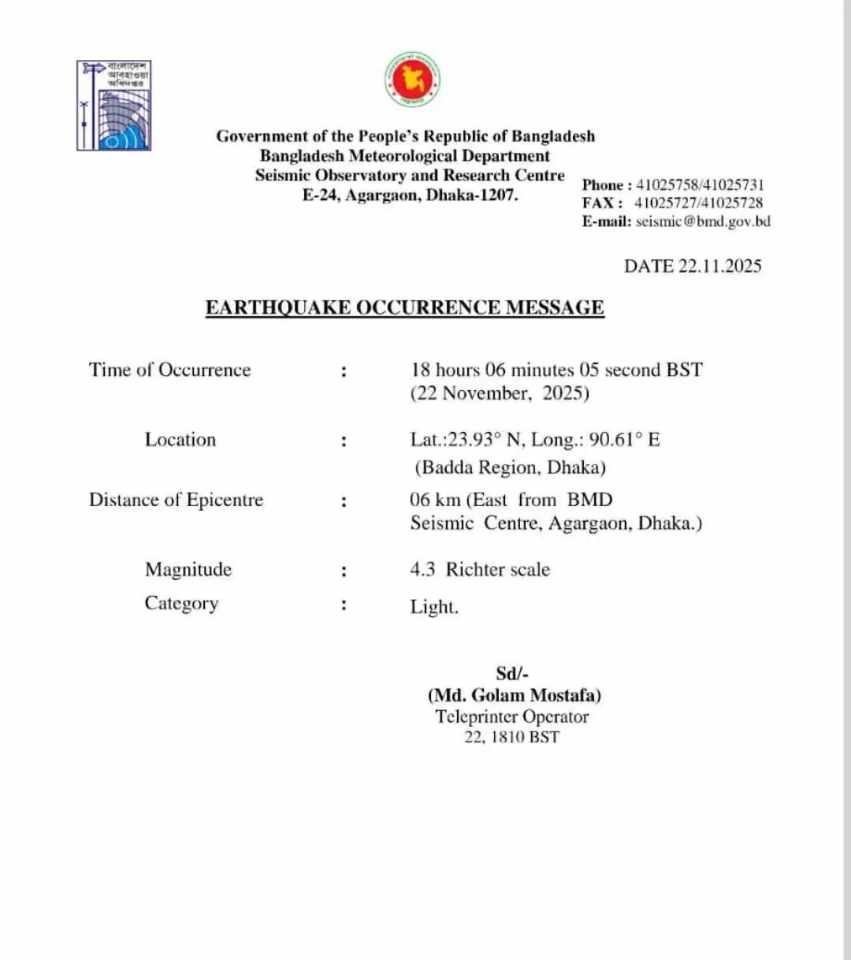 The official earthquake bulletin from the Bangladesh Meteorological Department confirms that the epicenter was in Dhaka’s Badda region, located 6 km east of the BMD Seismic Centre in Agargaon. The magnitude was recorded at 4.3 on the Richter scale, and the category was classified as Light.