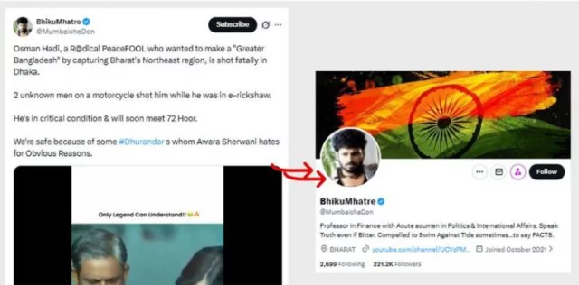 Accounts like BhikuMhatre and activist Dr. Rajesh Patil spread similar claims, falsely linking Hadi to anti-India intentions and threatening him. Another activist, Bhakt Prahlad, explicitly wrote, “This is new India—#Dhurandhar will target you for your anti-India stance.”