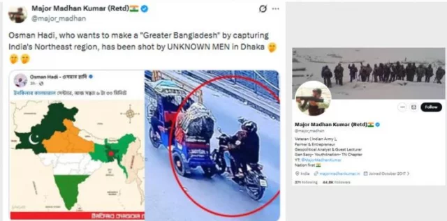 Former Indian army officer and general secretary of Youth4Nation – TN Chapter, Major Madhan Kumar (Retd.), claimed in an X post that Osman Hadi was shot by unknown assailants in Dhaka because he allegedly sought to seize India’s northeast to form a “Greater Bangladesh.” Analysis of his recent posts indicates he actively campaigns in support of India’s ruling Bharatiya Janata Party (BJP).
