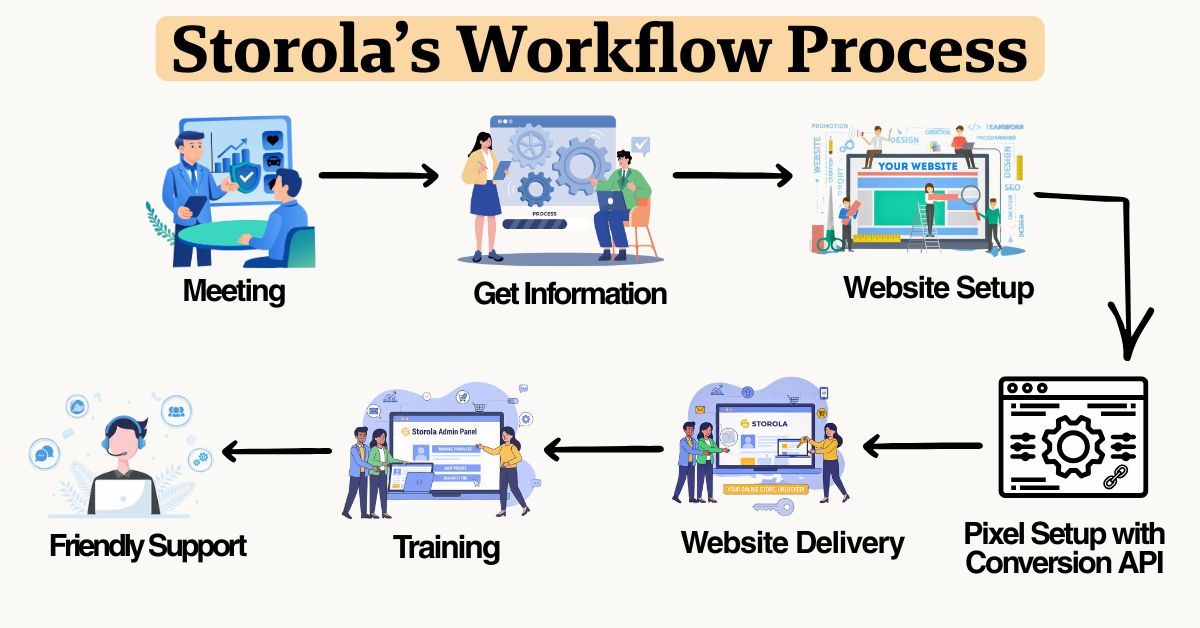 Storola follows a clear, seven-step process to ensure every client receives a smooth and efficient e-commerce setup experience. It begins with a meeting to understand the client’s business needs, followed by collecting essential information for customization. Next comes the website setup, where the platform is built according to the client’s preferences. Storola then handles Pixel setup with Conversion API for accurate tracking and analytics. Once completed, the project moves to website delivery, giving clients full access to their live store. Afterward, Storola provides training to help users operate their site confidently, along with friendly ongoing support to assist with any updates or technical needs.