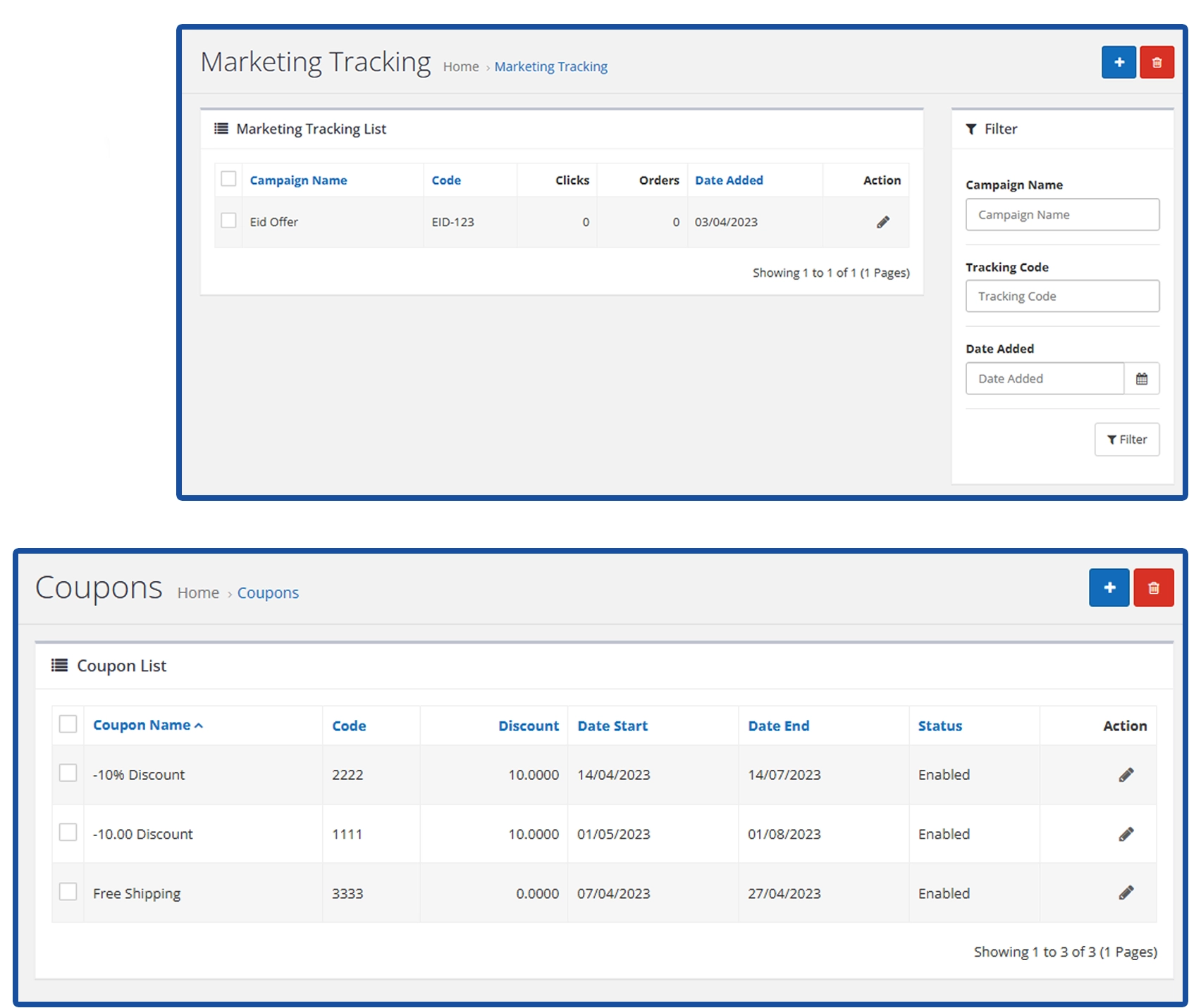 Storola lets you run and track marketing campaigns smoothly. Each campaign can use tracking codes or URLs to monitor its performance, giving you statistical insights on orders, visits, and clicks.